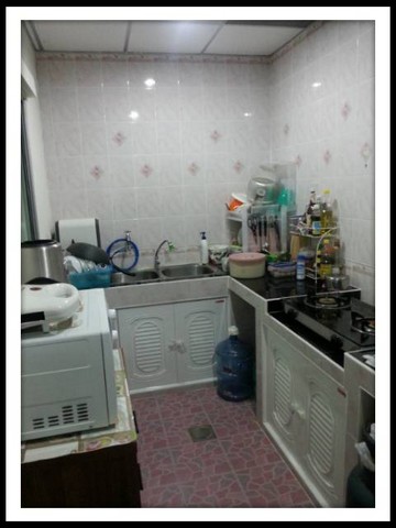 หลังบ้านต่อเติมห้องครัวพร้อมมีอ่างล้างจาน 2 อ่าง แบ่งโซนวางเครื่องซักผ้า