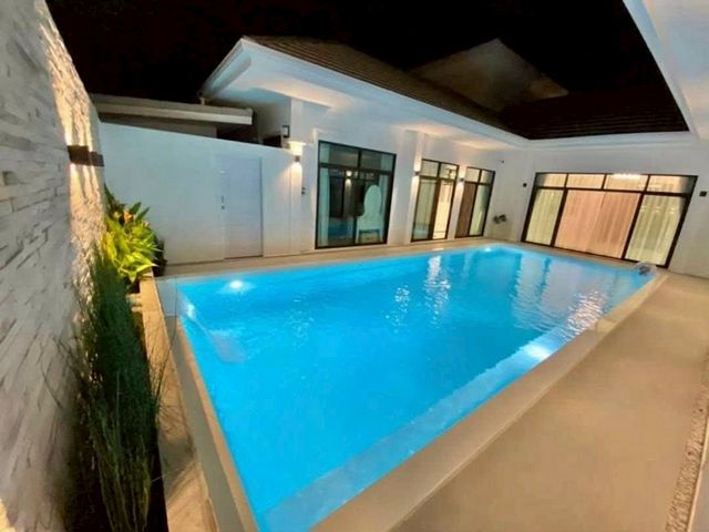 สระว่ายน้ำระบบเกลือกลางบ้าน 4×10 ม. พร้อมม่านน้ำ & มุม shower ส่วนตัว