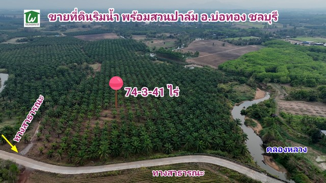 ขายที่ดินติดน้ำ อำเภอบ่อทอง ชลบุรี 74-3-41 ไร่ ขายที่ดินพร้อมสวนปาล์ม บ่อทอง ชลบุรี ขายที่ดินริมน้ำ บ่อทอง ชลบุรี มีน้ำใช้เพื่อการเกษตรตลอดปี ราคาไร่ละ 790,000บาท ปาล์มอายุ10ปีเก็บผลิตได้ ขายที่ดินติดน้ำบ่อทองชลบุรี