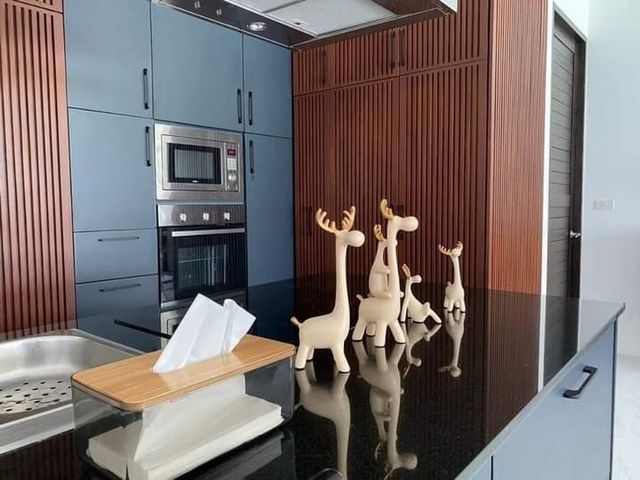 ครัวยุโรป แบบโอเพ่น แยกแบ่งออกเป็นสัดส่วน อุปกรณ์ไฟฟ้าครบครัน เตาไฟฟ้าที่ดูดควัน เตาอบ ไมโครเวฟ ตู้เย็นขนาดใหญ่
