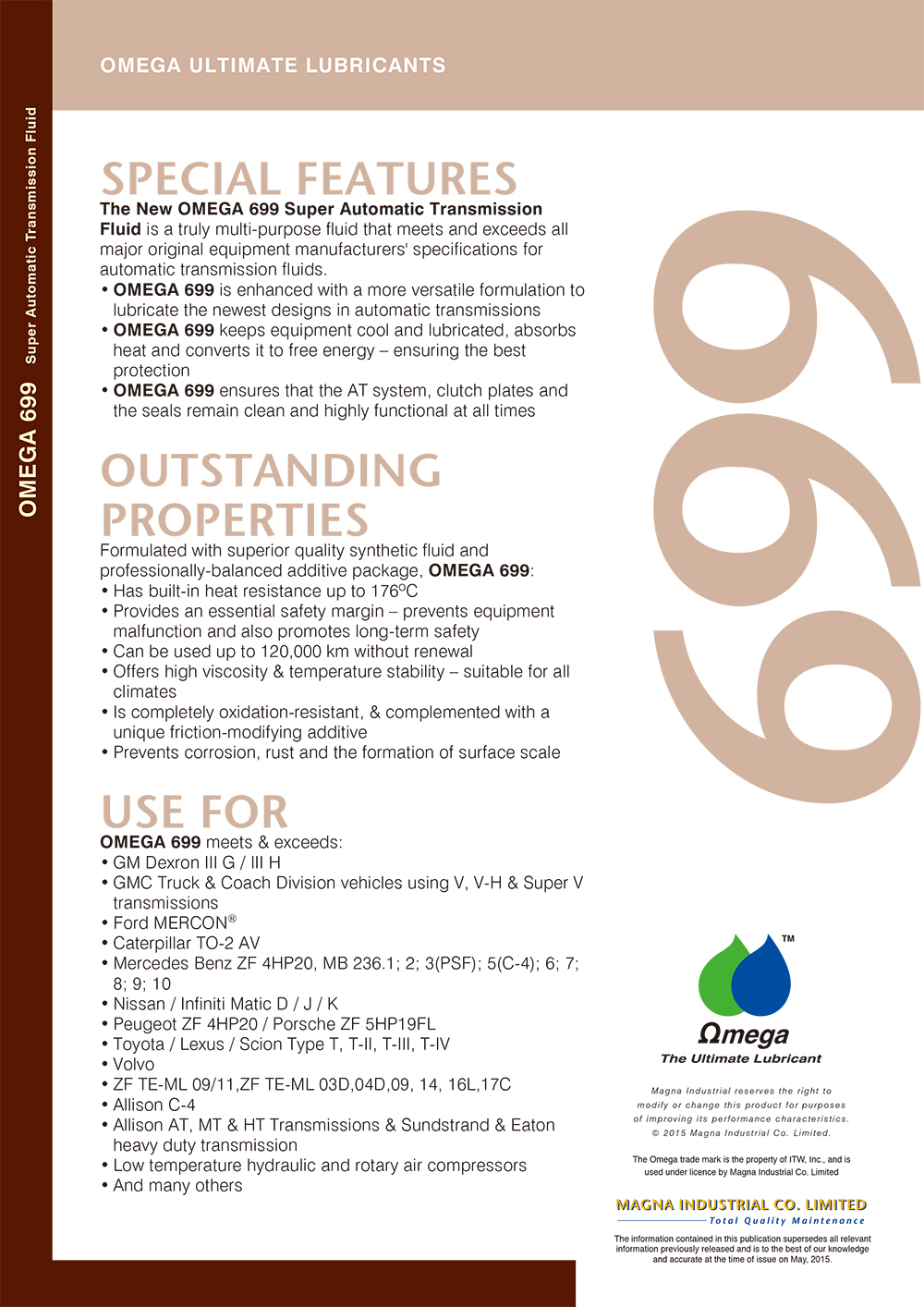 น้ำมันหล่อลื่น OMEGA 699 คือน้ำมันหล่อลื่นสำหรับ เกียร์ระบบอัตโนมัติ ( เกียร์ออโตเมติก ) ที่ทนความร้อนสูง