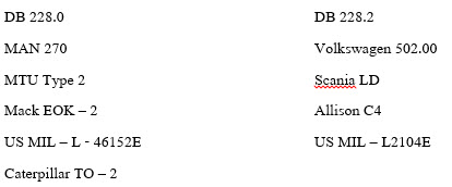 ในขณะที่น้ำมันหล่อลื่น OMEGA 643 มีความสามารถเทียบเท่าข้อกำหนดของ GM, Detroit Diesel Allison ( DDA )