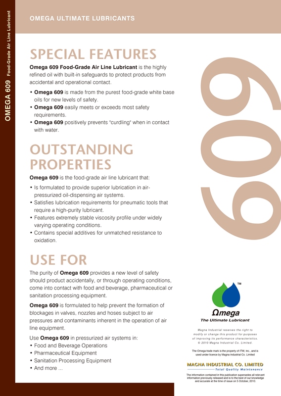 น้ำมันหล่อลื่นสำหรับท่อทางลมฟู้ดส์เกรด OMEGA 609 มีความสามารถเทียบเท่ากว่า หรือ สูงกว่าข้อกำหนดความปลอดภัยเกี่ยวกับคุณภาพ ระดับอาหารที่ต้องมีความบริสุทธิ์ และมีสมรรถนะการหล่อลื่นสูง ซึ่งทำให้อุปกรณ์สามารถใช้งานได้เต็มที่มากที่สุดน้ำมันหล่อลื่นสำหรับท่อทางลมฟู้ดส์เกรด OMEGA 609 ยังเป็นสารหล่อลื่นที่เป็นที่ยอมรับในการใช้งานในระบบนิวเมติก และอุปกรณ์ท่อทางลม ที่ต้องการสารหล่อลื่นความบริสุทธิ์สูง