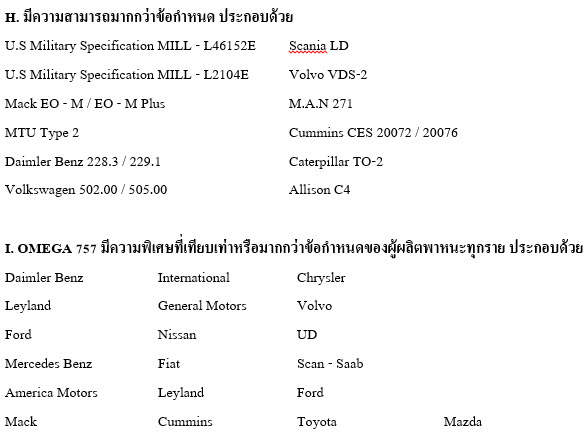 Omega 757 Long-Drain All-Fleet Engine Oil โอเมก้า 757 น้ำมันเครื่องฐานพาราฟิน ที่ให้อายุการใช้งานที่ยาวนาน ถูกผลิตด้วยส่วนผสมของ Ultra - Low Ash Megalite เหนือกว่ามาตรฐานของ GM Detroit Allison ให้การหล่อลื่นได้ถึง 50,000.00 ไมล์ หรือ ( 81,000 กิโลเมตร ) ภายใต้การทำงานที่แน่นอนเชื่อถือได้ เกรดน้ำมันพร้อมใช้ SAE 15 W 40 , 20 W 50