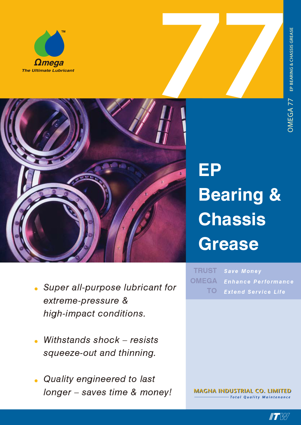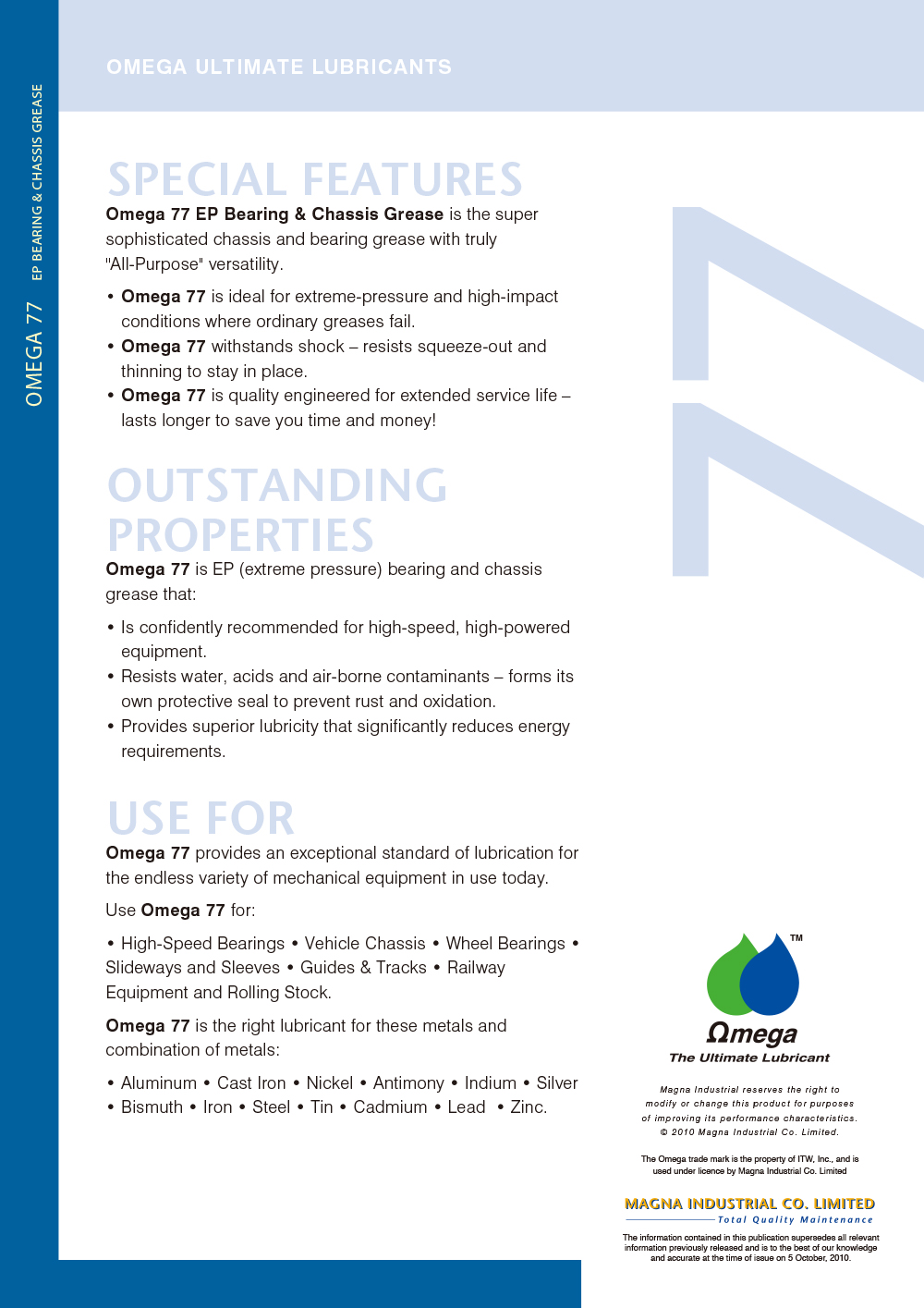 จารบีหล่อลื่น OMEGA 77 เป็นสารหล่อลื่นสำหรับแบริ่งรอบจัด และชัซซีที่ทนต่อการกระแทก และแรงเหวี่ยง และแรงสลัดที่ทันสมัย จารบีหล่อลื่นOMEGA 77 ให้มาตรฐานการหล่อลื่นที่พิเศษสุดสำหรับเครื่องจักรกลนานาประเภทที่ใช้ในทุกวันนี้อย่างไม่มีที่สิ้นสุด ส่งผลให้สามารถลดปริมาณการเก็บสต็อกสินค้าคงคลัง และลดเวลาที่เครื่องจะต้องหยุดการทำงานลง และลดค่าใช้จ่ายในการซ่อมบำรุงรักษาเครื่องจักรลงได้อย่างมาก