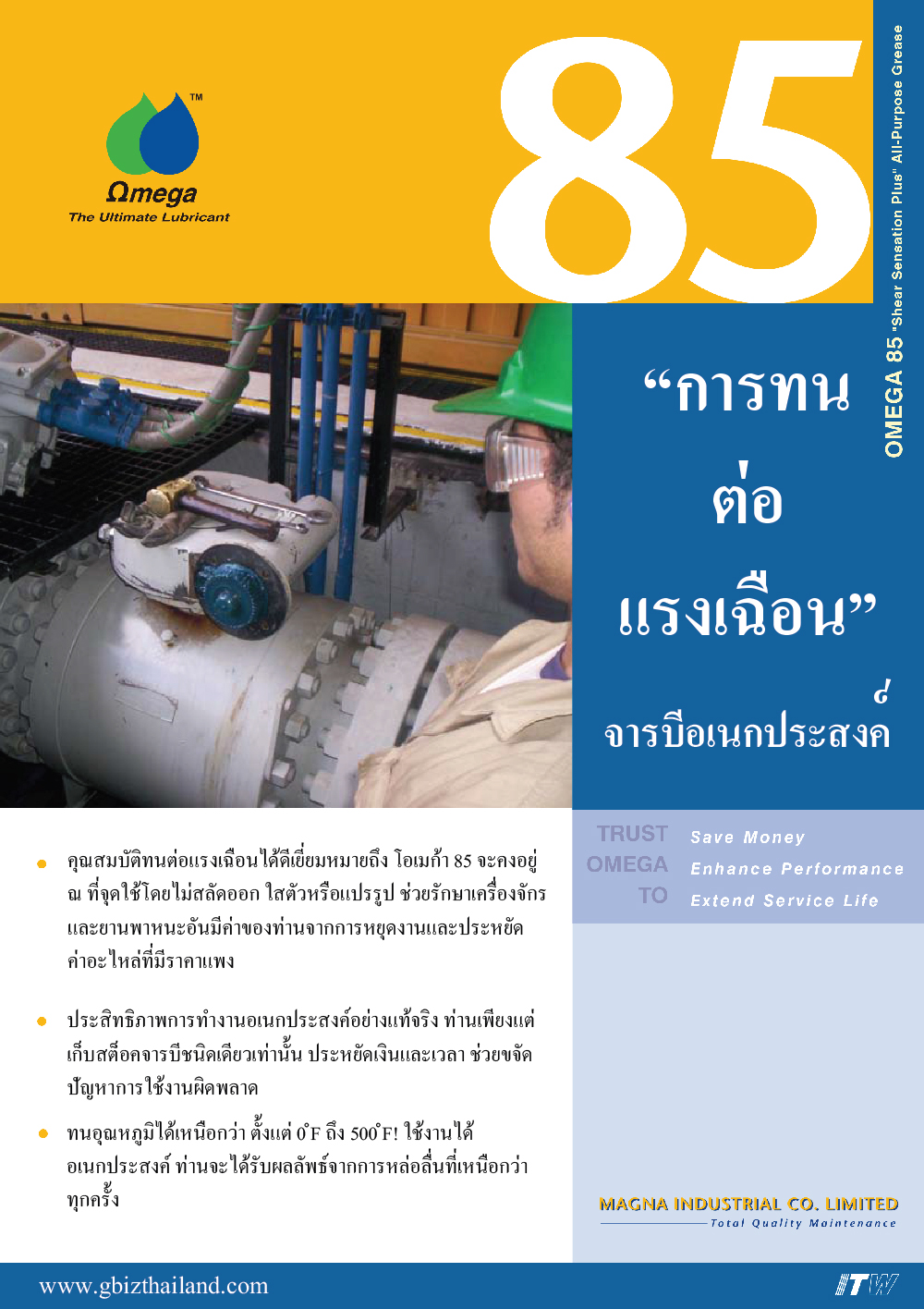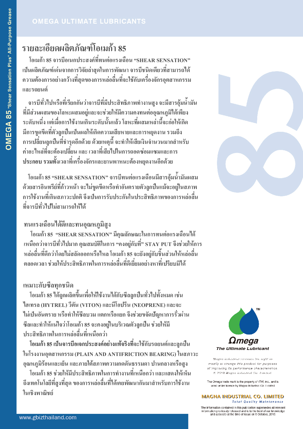 OMEGA 85 "Shear Sensation Plus" All-Purpose Grease จารบีหล่อลื่น ทนต่อแรงเฉือน vibation ช่วยลดอุณภูมิ ลดเสียง เข้ากับโลหะ ซีลยาง สามารถเข้าจารบีได้ทุกชนิด ถูกจารบีที่พัฒนาสำหรับการแก้ปัญหาการใช้งาน ในอุตสาหกรรมปิโตเคมี อุตสาหกรรมยานยนต์ มอเตอร์เขย่า ,LV MV HV HT motor ทุกชนิด จัดเป็นจารบีอเนกประสงค์มาตราฐาน