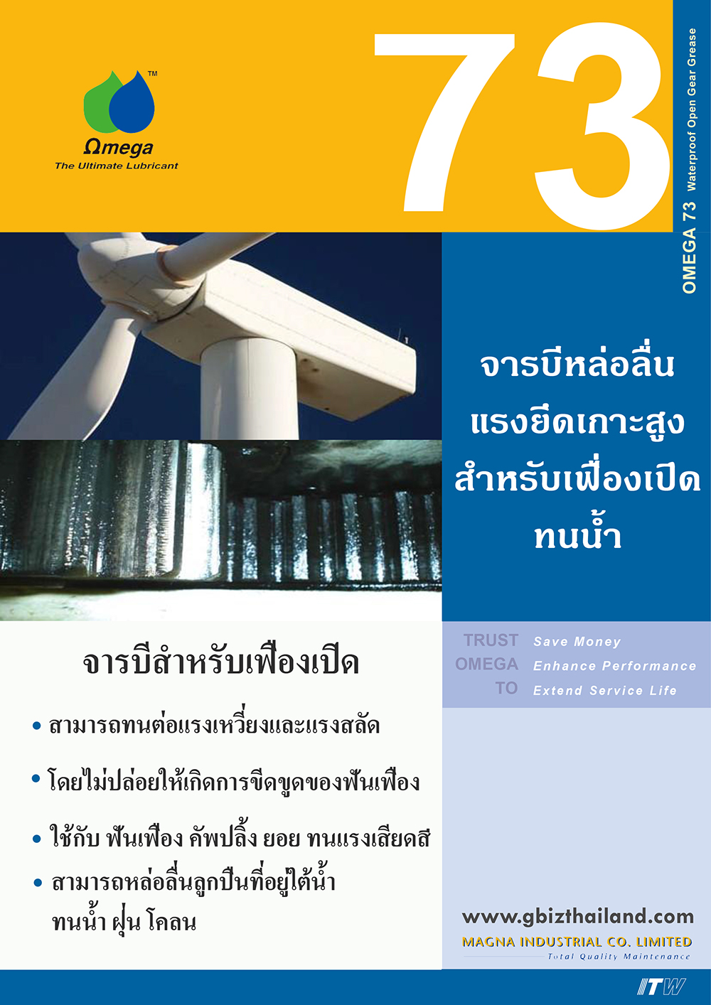 จารบีหล่อลื่น OMEGA 73 มีสารเสริมคุณภาพที่ทนต่อแรงเหวี่ยง และแรงสลัดได้ดี และทนแรงกดดันสูงมาก