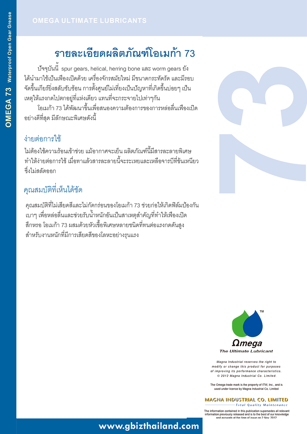 OMEGA 73 เป็นสารหล่อลื่นพิเศษสำหรับเฟืองเปิด ที่ทนต่ออากาศ สามารถยึดติดอย่างเหนียวแน่นอยู่กับที่