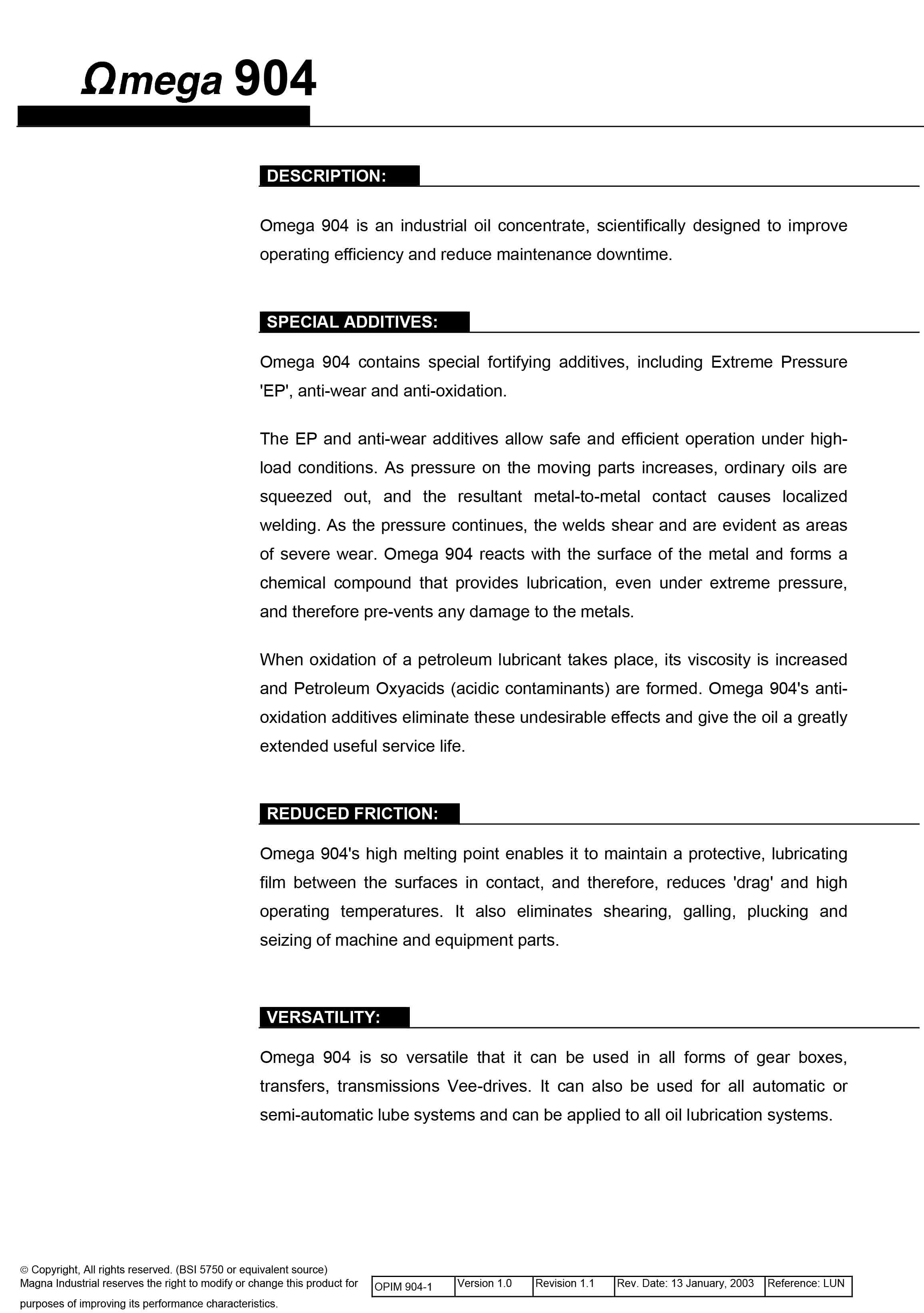 จุดหลอมเหลวของ OMEGA 904 สูงทำให้สามารถคงฟิล์มป้องกันสำหรับการหล่อลื่นไว้ ระหว่างผิวกระทบดังนั้นจะลดการเสียดสีลง และใช้งานที่อุณหภูมิสูงได้ และยังขจัด การเฉือน, การเกิดผิวหยาบ, การกระชาก และการยืดติดของผิวโลหะของเครื่องจักร และชิ้นส่วนอุปกรณ์