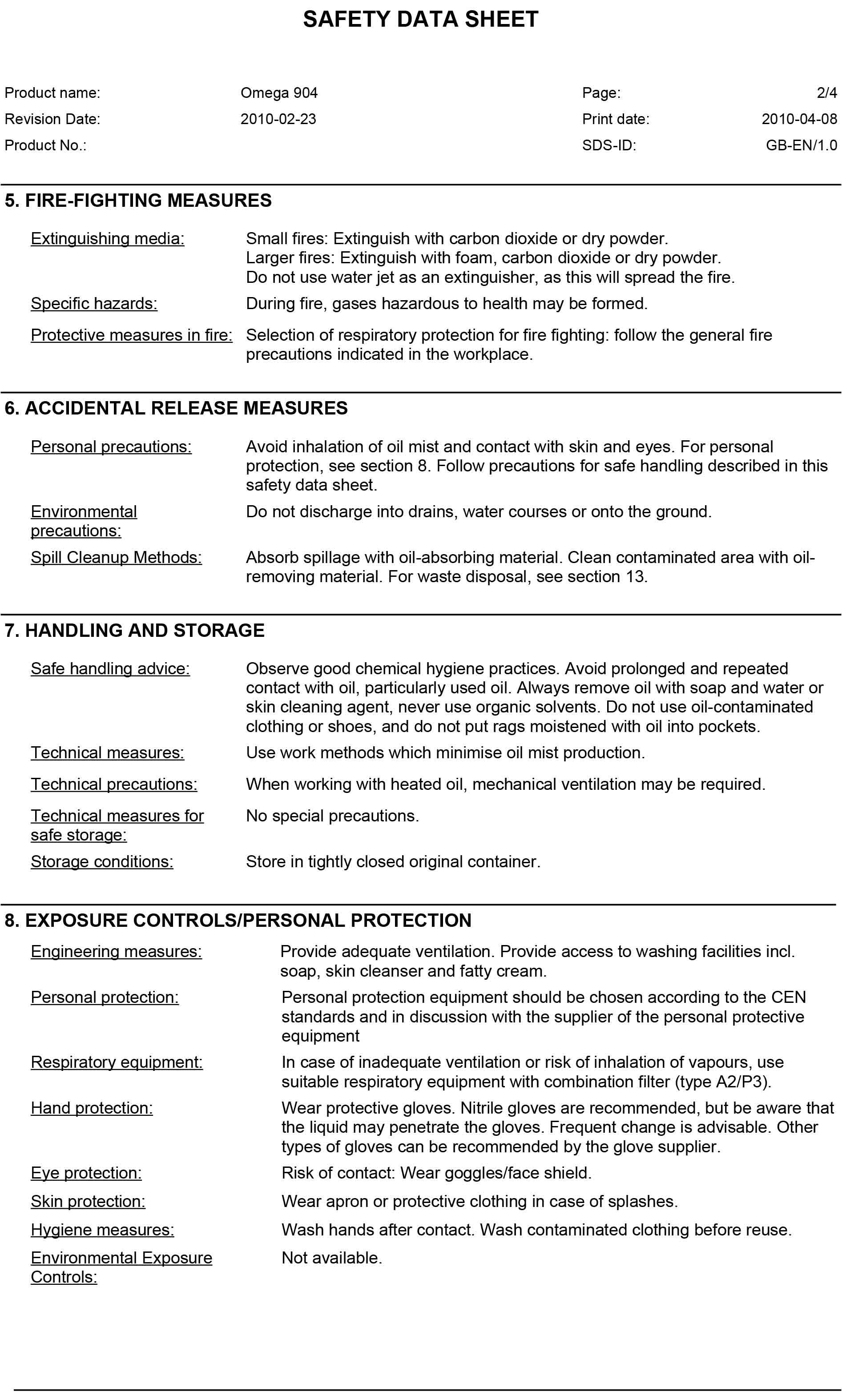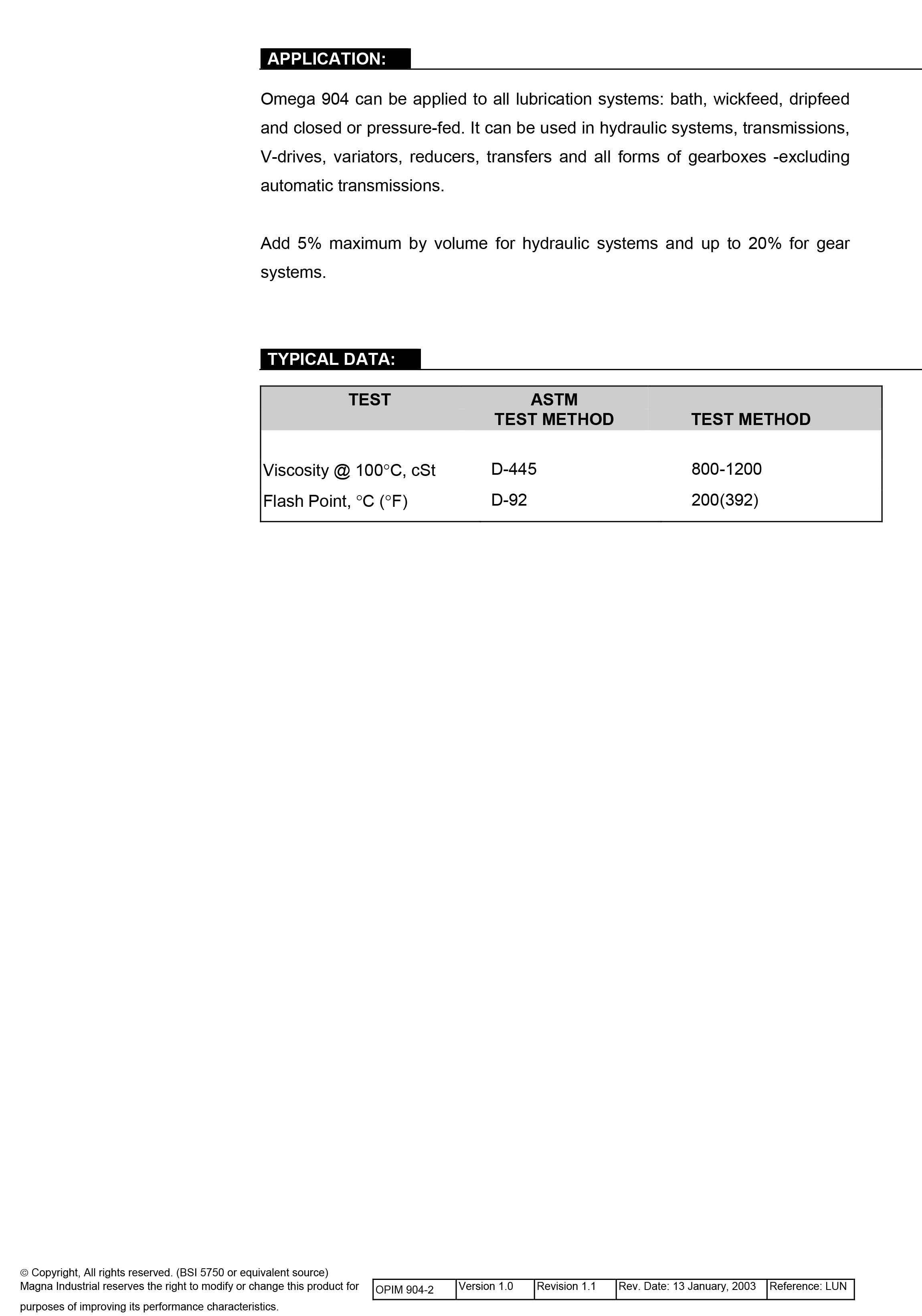 OMEGA 904 สามารถใช้กับระบบการหล่อลื่นทุกระบบ รวมทั้งการป้อนแบบเชือกน้ำมัน การป้อนหยด และป้อนด้วยแรงดัน, ใช้ได้กับระบบไฮดรอลิก, ชุดส่งถ่ายกำลัง, ชุดขับวี, ชุดเปลี่ยนแปลง (variation), ตัวลด (reducers), การขนถ่ายของกล่องเฟือง, ระบบส่งถ่ายแบบอัตโนมัติสามารถเติมได้สูงสุด 5% โดยปริมาตรสำหรับระบบไฮดรอลิก และเพิ่มถึง 20 % สำหรับระบบเฟือง หรือ แล้วแต่การใช้งานของสภาพเครื่องจักร