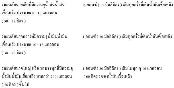 1 ออนซ์ (30มิลลิลิตร ) เติมทุกครั้งที่เติมน้ำมันเชื้อเพลิง