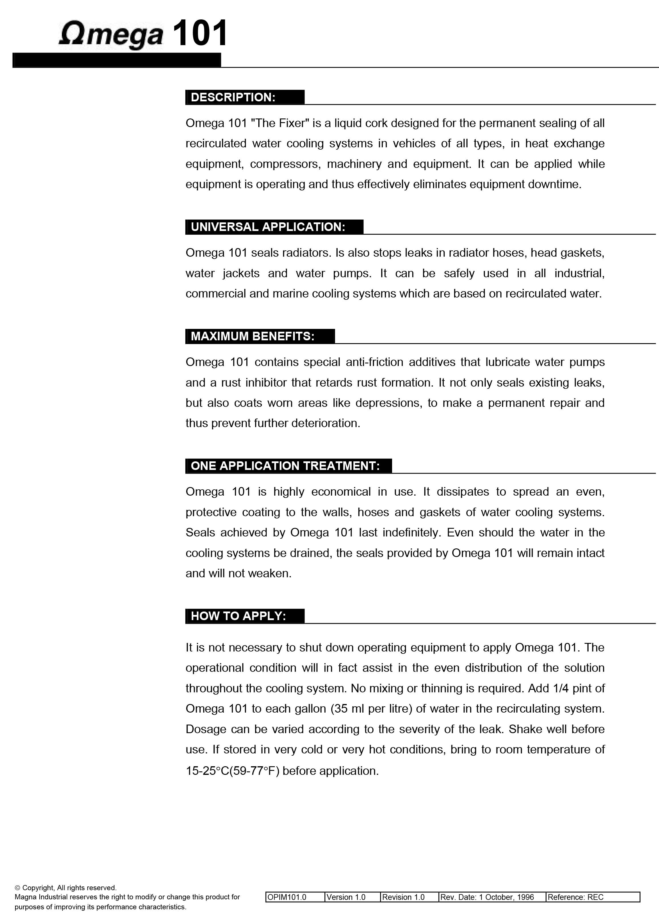 การเติม OMEGA 101 ไม่จำเป็นต้องปิดระบบการทำงานของเครื่องจักร และอุปกรณ์ สภาวะการทำงานอยู่จะช่วยให้การกระจายตัวของสารละลายสามารถไปได้ทั่วระบบหล่อเย็น ไม่จำเป็นต้องผสม หรือ ทำให้เจือจางเติม OMEGA 101 เพียง ¼ พินท์ ต่อน้ำ 1 แกลลอน ( 35 มิลลิลิตร ต่อลิตร ) ในระบบไหลเวียน ปริมาณการเติม สามารถเปลี่ยนแปลงได้ให้สอดคล้องกับความรุนแรงของการรั่วซึม เขย่าก่อนใช้งาน หากเก็บในที่เย็นจัด หรือที่ร้อนจัดให้นำออกสู่อุณหภูมิห้องที่ประมาณ 15 – 25 OC ( 59 – 77 OF ) ก่อนนำไปใช้งาน