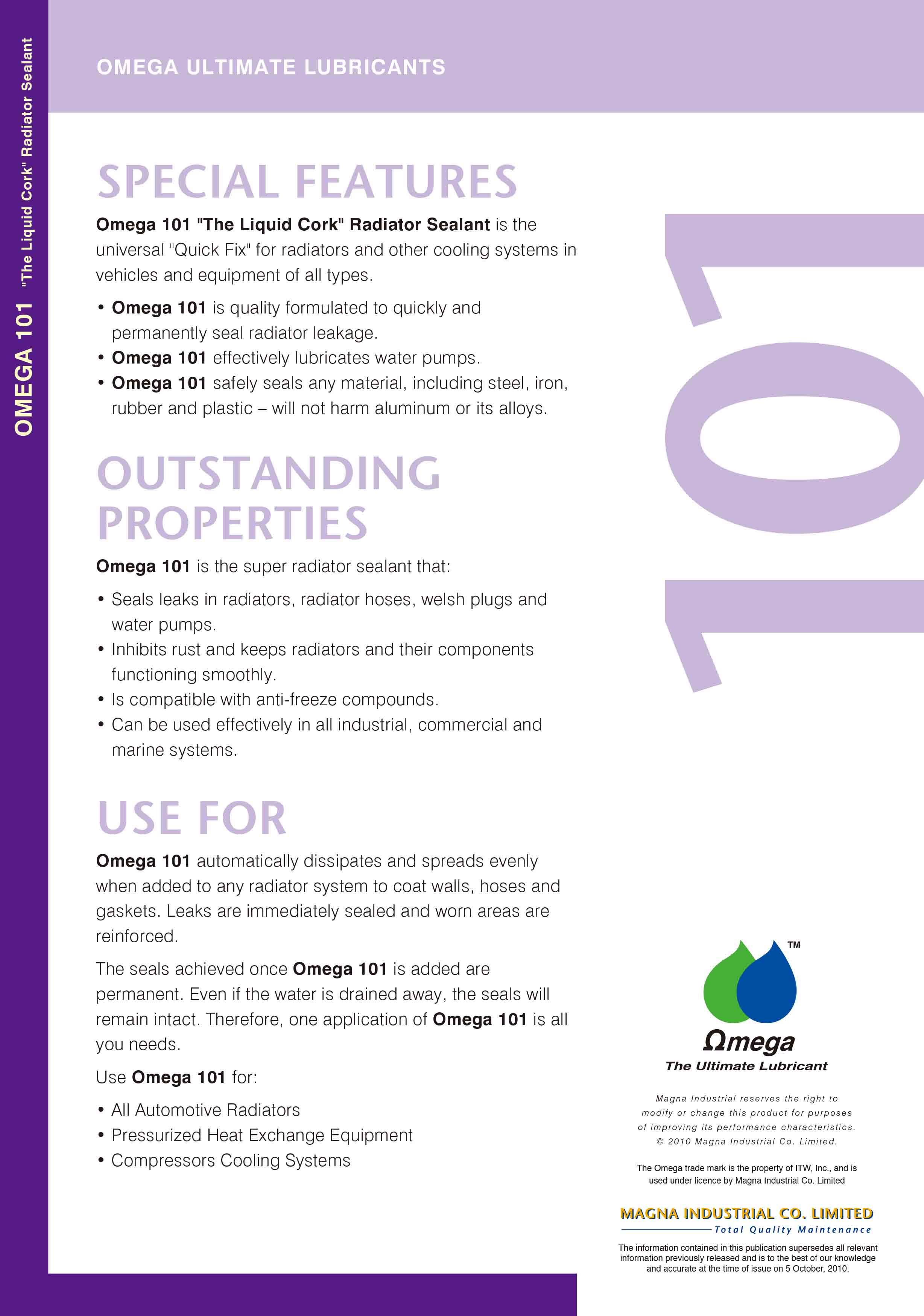 OMEGA 101 มีความประหยัดในการใช้งานอย่างมาก มันจะกระจายตัว และวิ่งเข้าสร้างผิวปกป้องบริเวณผนัง, ท่อ และประเก็น ในระบบหล่อเย็น ซีลที่ได้รับการปรับปรุงจาก OMEGA 101 จะมีอายุการใช้งานที่ยาวนานในกรณีที่น้ำในระบบถูกถ่ายออก ซีลจะยังคงถูกปกคลุมด้วย OMEGA 101 และจะไม่เกิดการเสื่อมสภาพลง