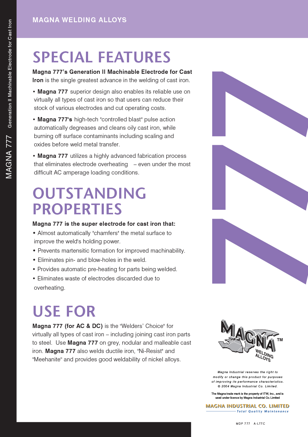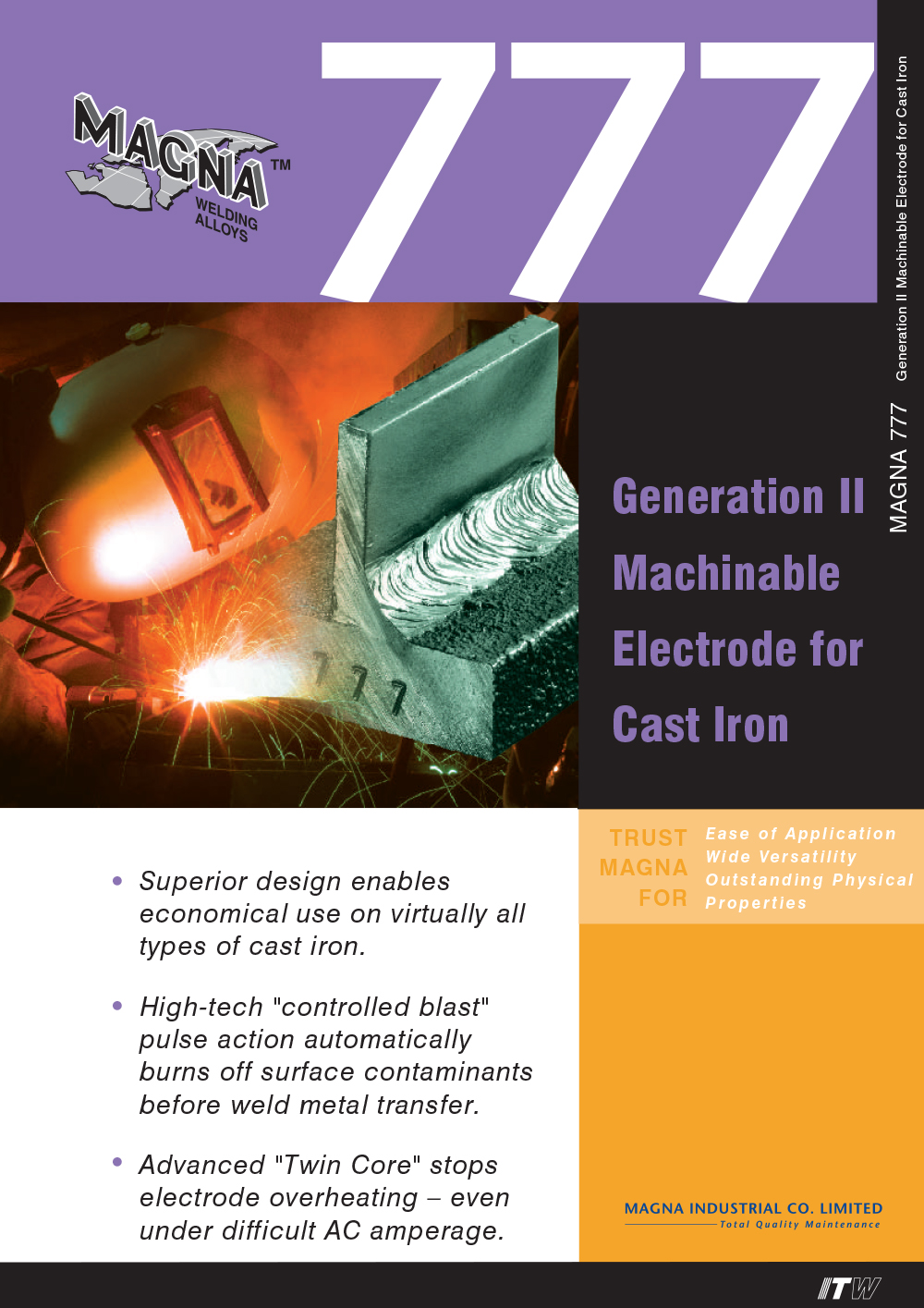 MAGNA 777 เป็นลวดเชื่อมเหล็กหล่อชนิดใหม่ที่ใช้กระบวนการประกอบ “Twin core” ที่ทันสมัยมากสามารถกำจัดโอกาสที่ลวดเชื่อมจะร้อนเกินไปได้โดยสิ้นเชิงเมื่อใช้กระแส AC แม้ภายใต้สภาวะภาระกระแสที่ไม่ปรกติคุณลักษณะพิเศษนี้ช่วยให้เกิดความประหยัดได้มากสำหรับผู้ใช้ เนื่องจากลวดเชื่อมสามารถถูกใช้ได้จนหมดไม่ต้องทิ้งลวดเชื่อมจากการร้อนเกินไปนอกจากนี้คุณลักษณะการควบคุมอุณหภูมิที่ยอดเยี่ยมของ MAGNA 777 Twin Core ช่วยให้ความร้อนสม่ำเสมอและการไหลของน้ำโลหะช่วยให้เกิดความเป็นเนื้อเดียวกันของเนื้อเชื่อมและลดการเกิดสเก็ดน้ำโลหะ