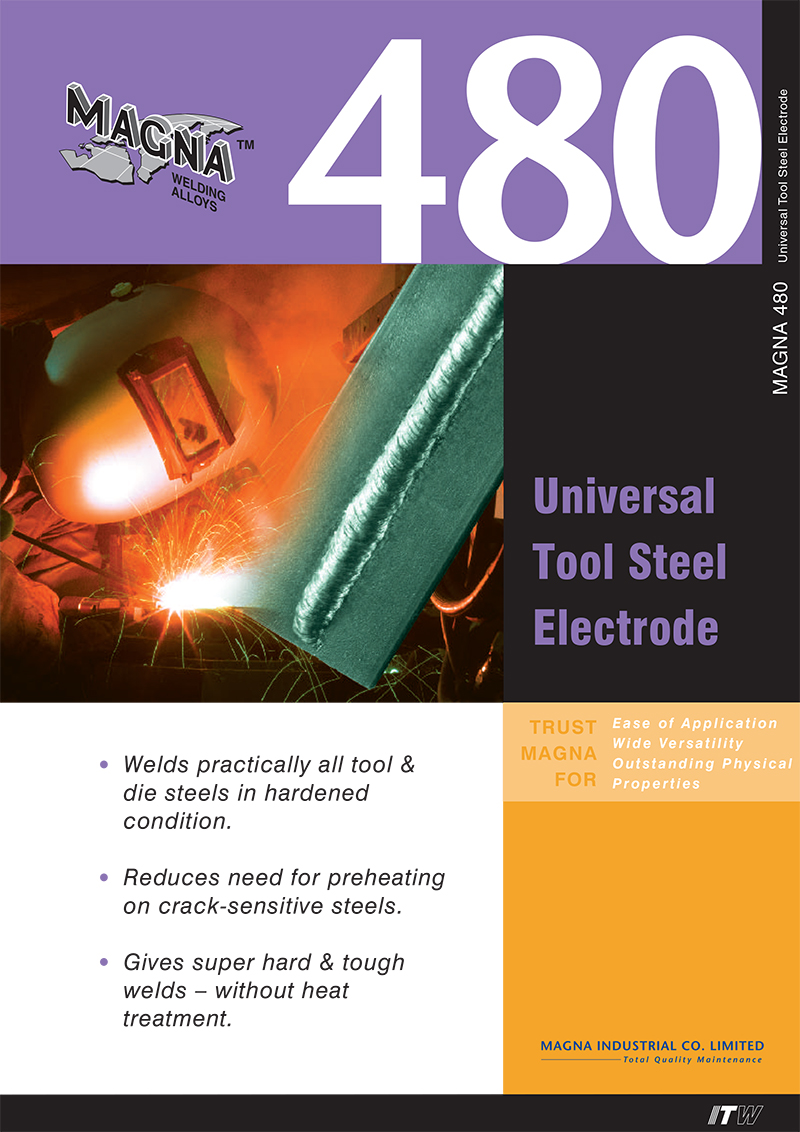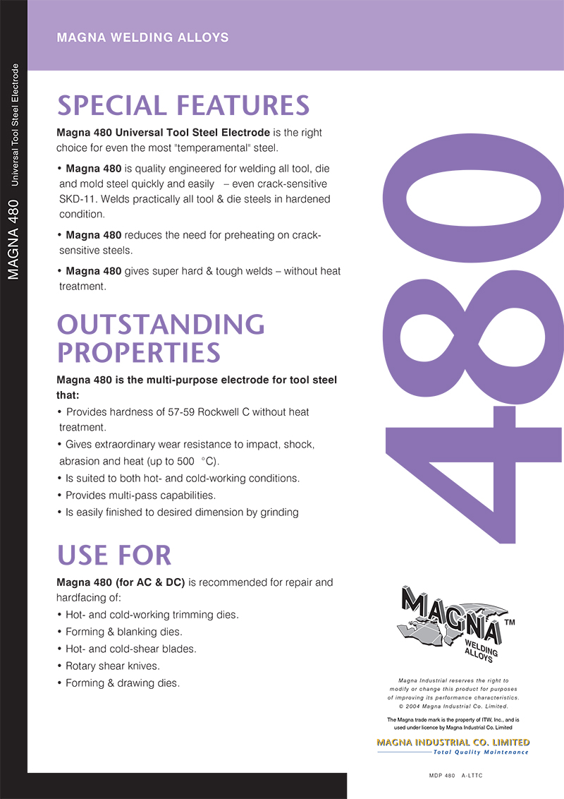 ด้วย MAGNA 480 แม้กระทั่ง SKD - 11 ที่ยากต่อการเชื่อมหรือเหล็กเครื่องมือที่คล้ายคลึงกันก็สามารถทำการเชื่อมได้โดยไม่มีปัญหาการแตกร้าวในบริเวณกระทบร้อนใกล้แนวเชื่อมเพียงใช้การอุ่นงานก่อนการเชื่อม 250 ถึง 300 องศาเซลเซียสเท่านั้นซึ่งขึ้นอยู่กับการอบคืนตัวของเหล็กชนิดที่ทำการเชื่อมและเนื่องจากความต้องการในการใช้กระแสเชื่อมต่ำดังนั้น MAGNA 480 สามารถใช้เครื่องเชื่อม AC ที่มีกำลังต่ำได้