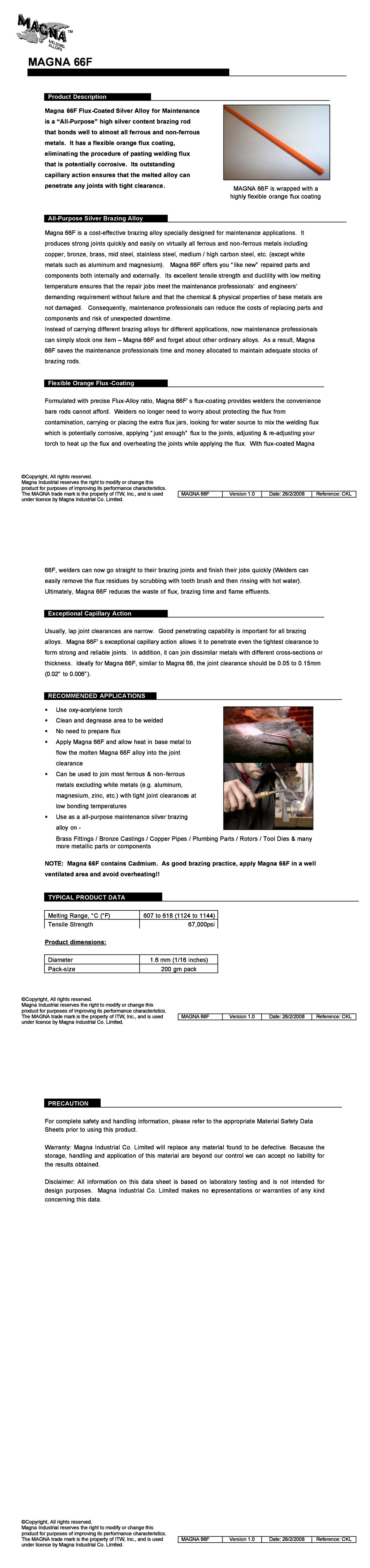 แมกน่า 66 ลวดเชื่อมเงินเปอร์เซ็นต์สูงสำหรับงานซ่อมบำรุง Specially formulated for use With Magna 66 (Corrosive Classification ) เป็นลวดเชื่อมเงิน “เอนกประสงค์” อย่างแท้จริง มีขีดความสามารถในการแทรกตัวเข้าไปในรอยต่อได้ดีมาก แม้ว่า จะเป็นช่องแคบๆ