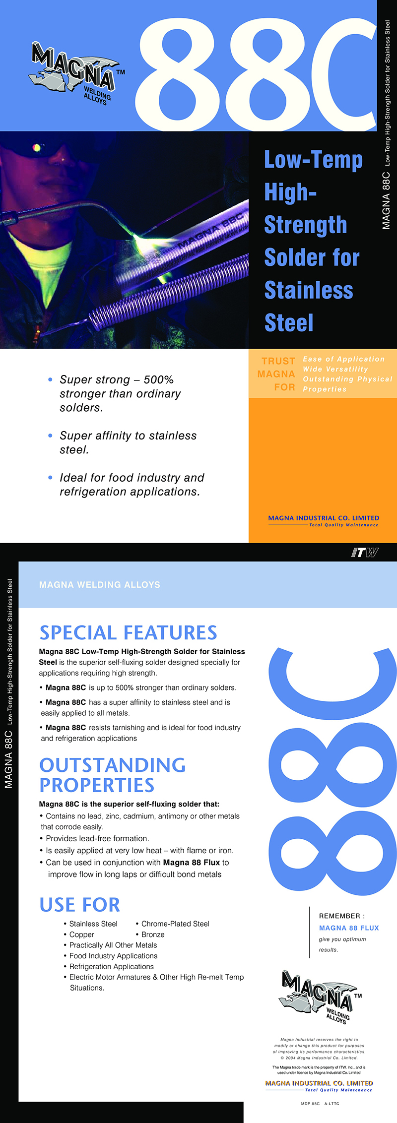 สูตรสำหรับ MAGNA 88C ที่มีค่าการนำไฟฟ้าสูงที่สุดในบรรดาลวดบัดกรีอุณหภูมิต่ำที่เคยมีมามีความแข็งมากกว่าลวดบัดกรีทั่ว ๆ ไปมากและใช้ในการซ่อมแซมเหล็กกล้าที่มีตำหนิเนื่องจากคุณสมบัติด้านความแข็งแรงของ MAGNA 88 C อยู่ในระดับค่อนข้างสูงมากให้ความแข็งแรงสูงกว่าลวดบัดกรีทั่วไปถึง 7 เท่าเหมาะสำหรับการบัดกรีในกรณีที่ต้อสัมผัสกับอาหารเนื่องจากไม่มีธาตุตะกั่ว, แอนติโมนี, สังกะสี, บิสมัท และ แคดเมียม