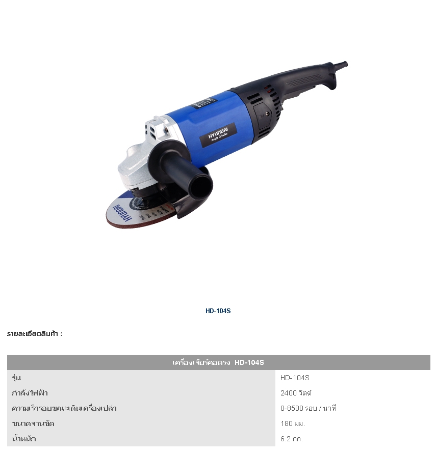 เครื่องเจียรไฟฟ้า 7" รุ่น HD-104S ฮุนได Hyundai กำลังไฟ 2400 วัตต์ ความเร็วรอบ 8500รอบ/นาที ขนาดจานขัด 7"