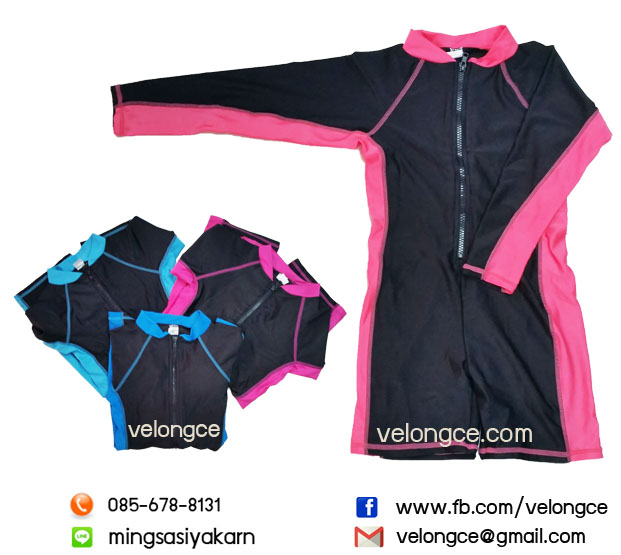 ชุดเด็กมีแขนยาวเต็มตัว มีซิป มีสีฟ้า กรม และ ชมพู ไซซ์ 8,10,12,14,16 และ 18