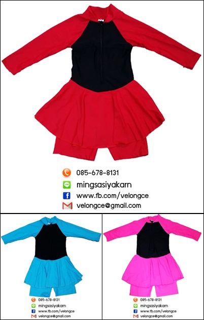 รุ่น 803 ชุดว่ายน้ำเด็กหญิง ชิ้นเดียวแขนยาวมีซิปสีพื้นมีกระโปรงคลุม พร้อมกางเกงขาสั้นด้านใน แถบสีแดง ฟ้า ชมพู size 14-16-18