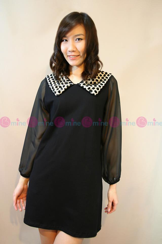 เดรสผ้ายืดสีดำ เล่นลูกเล่นที่ปกเสื้อด้วยผ้าตาข่ายแต่งเป็นดอกกุหลาบเล็กๆๆเรียงกัน