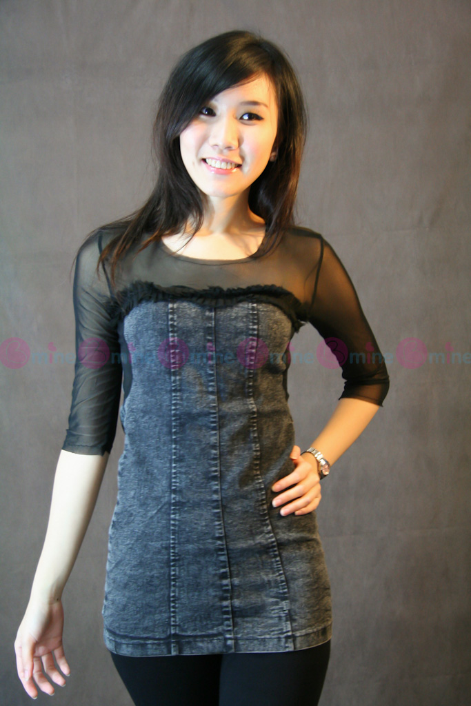 (สินค้าหมดจ้า) มินิเดรสผ้ายืดยีนส์ฟอกสีดำ แต่งด้วยผ้าซีทรูช่วงบน